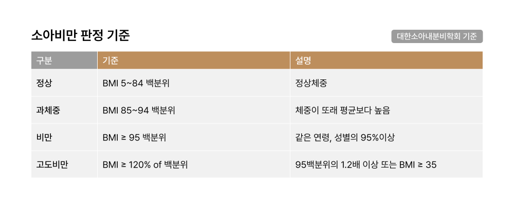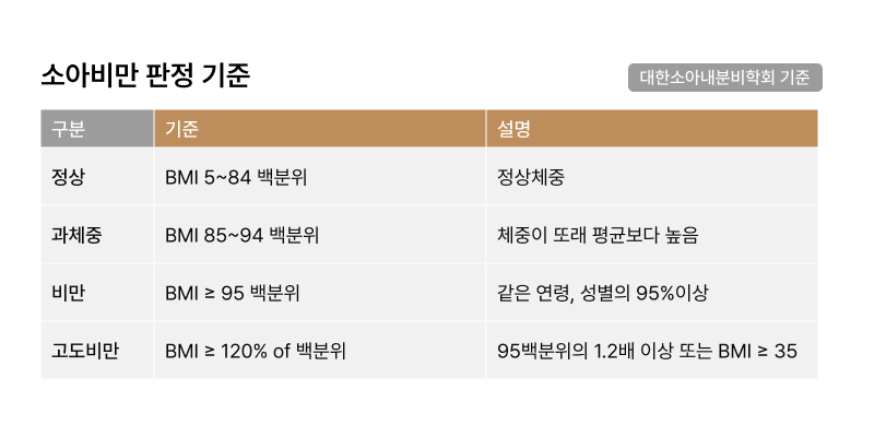 따라서 정확한 체중 상태는 나이·성별별 소아 BMI 성장곡선을 기준으로 판단합니다.